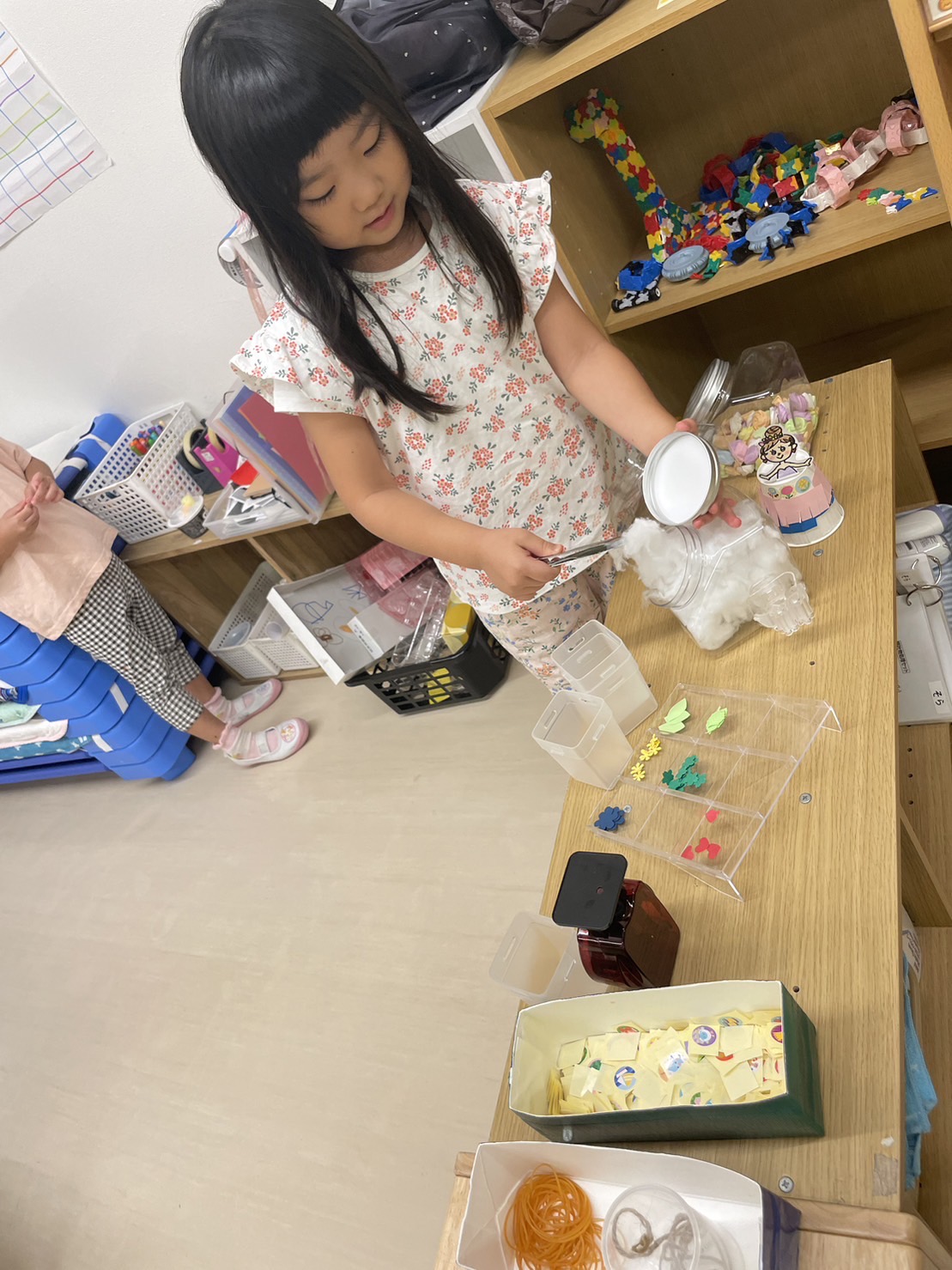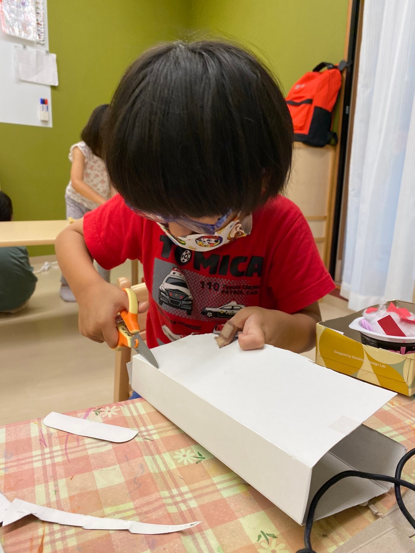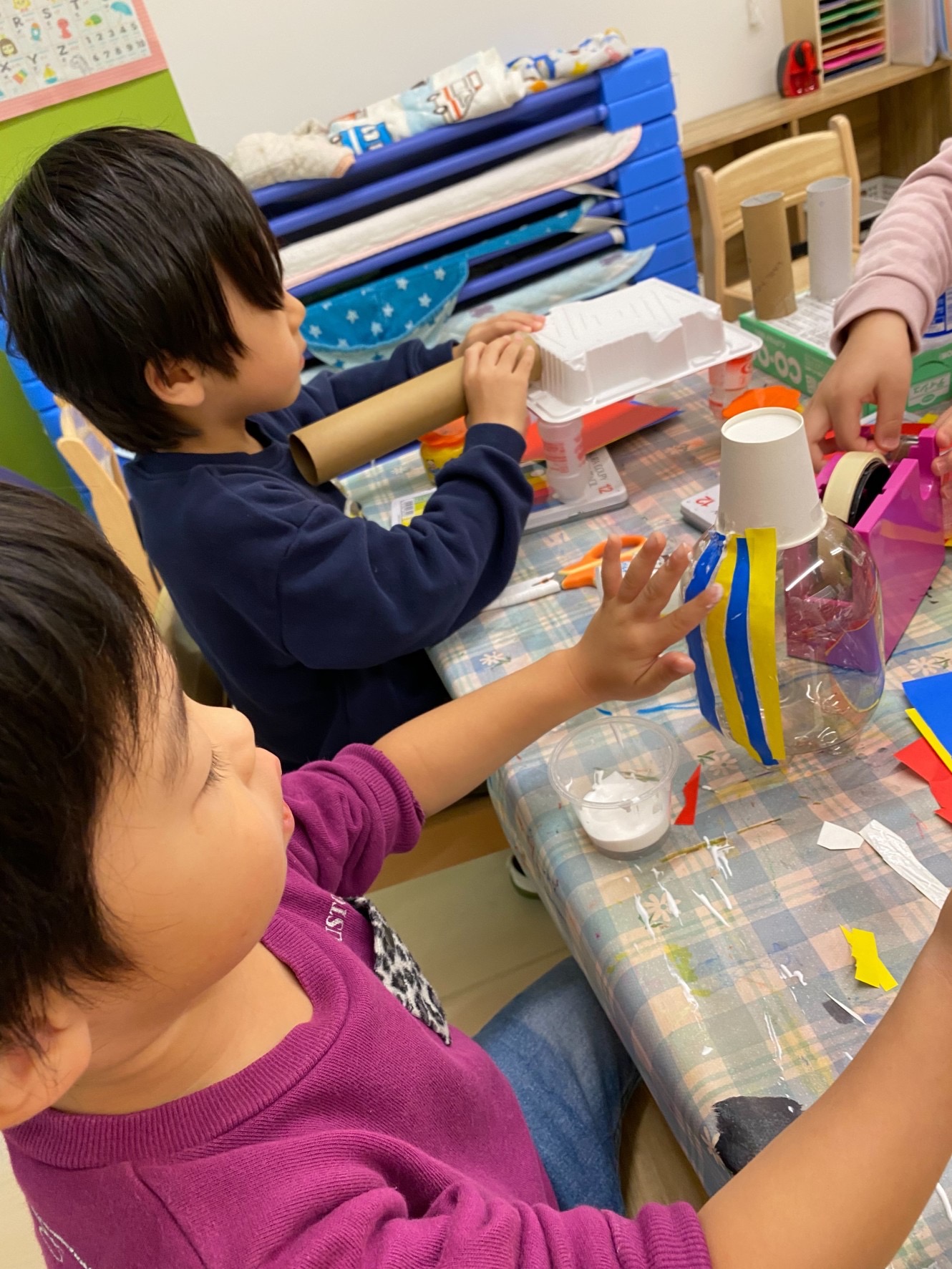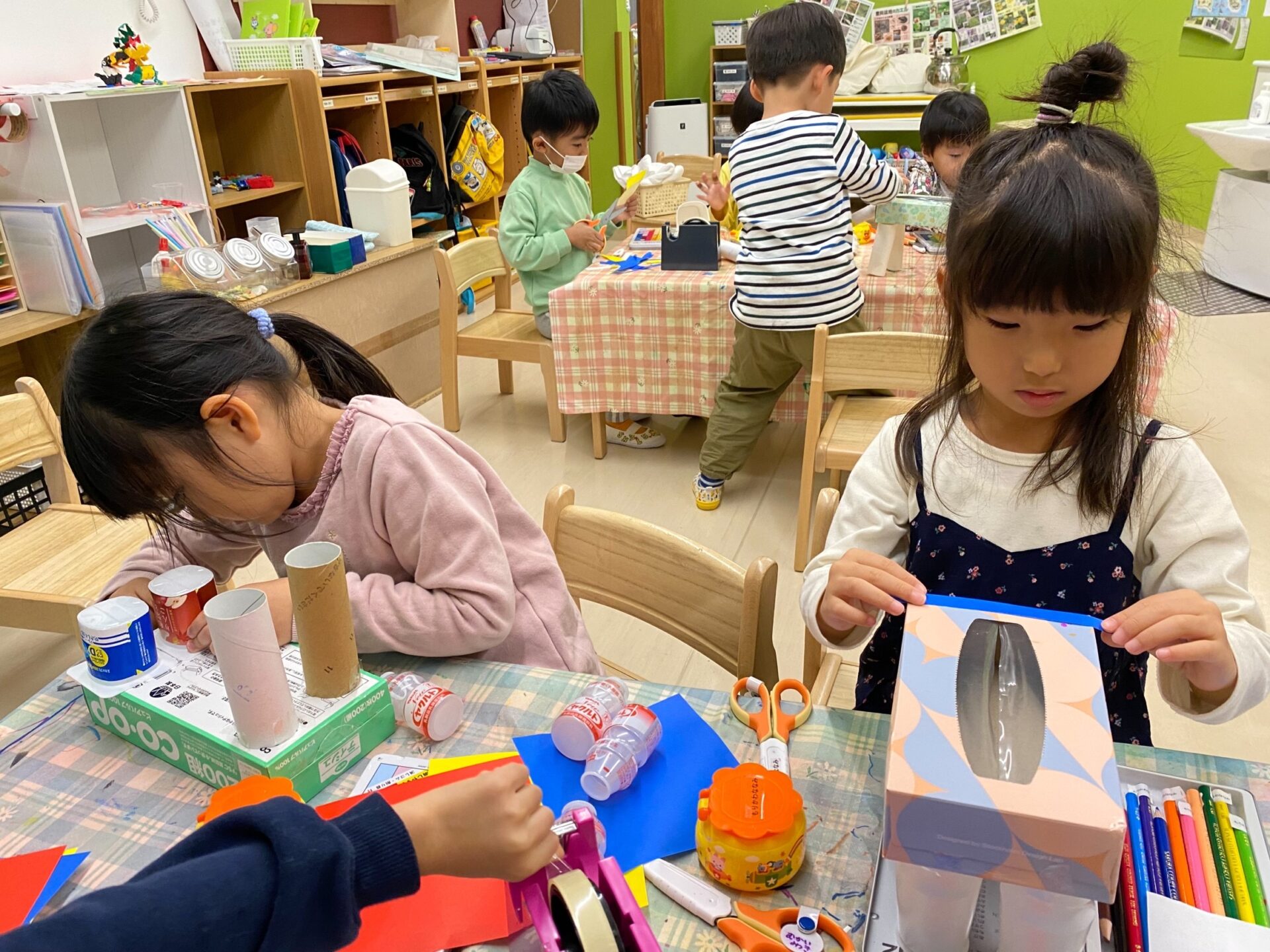 今回は幼児クラスの廃材遊びについてご紹介したいと思います!ご家庭から使用した牛乳パックやトレー等を、持って来て頂きいつでも廃材遊びが出来るように幼児クラスでは、このようにしてコーナーを設けています☺️