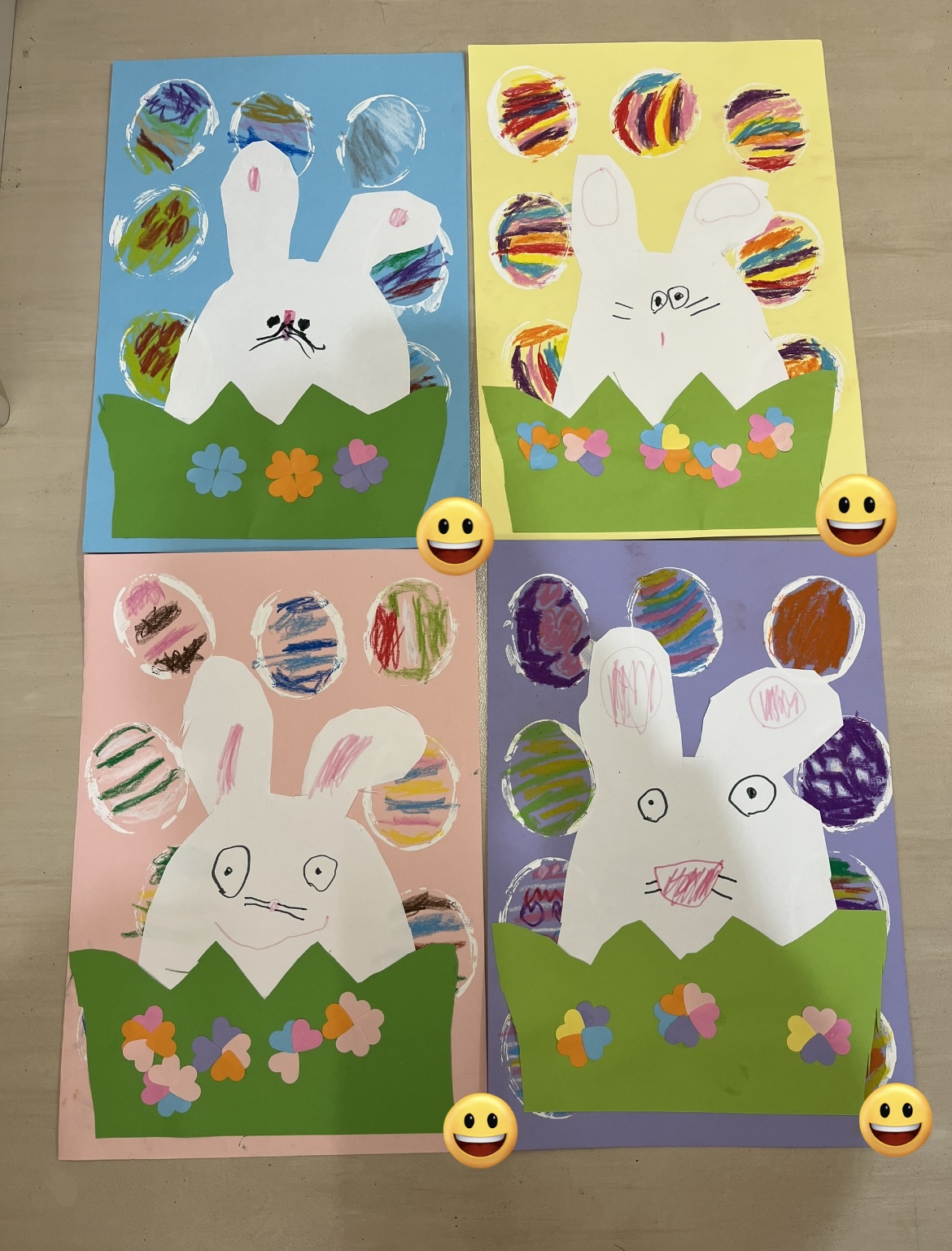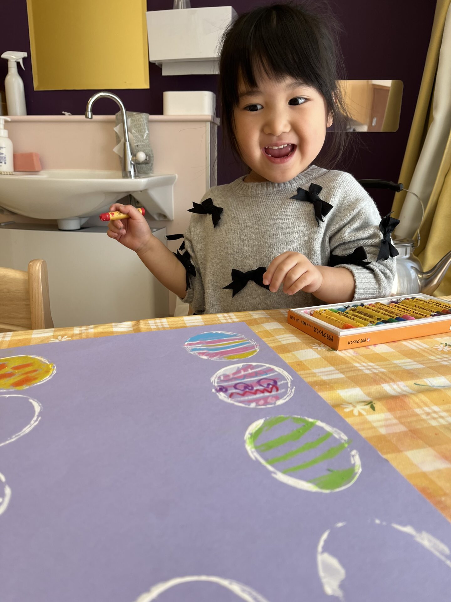 最後は台紙にイースターの卵をプリンカップでスタンプをして、ひとつずつに好きな模様をクレヨンで描きました🖍
