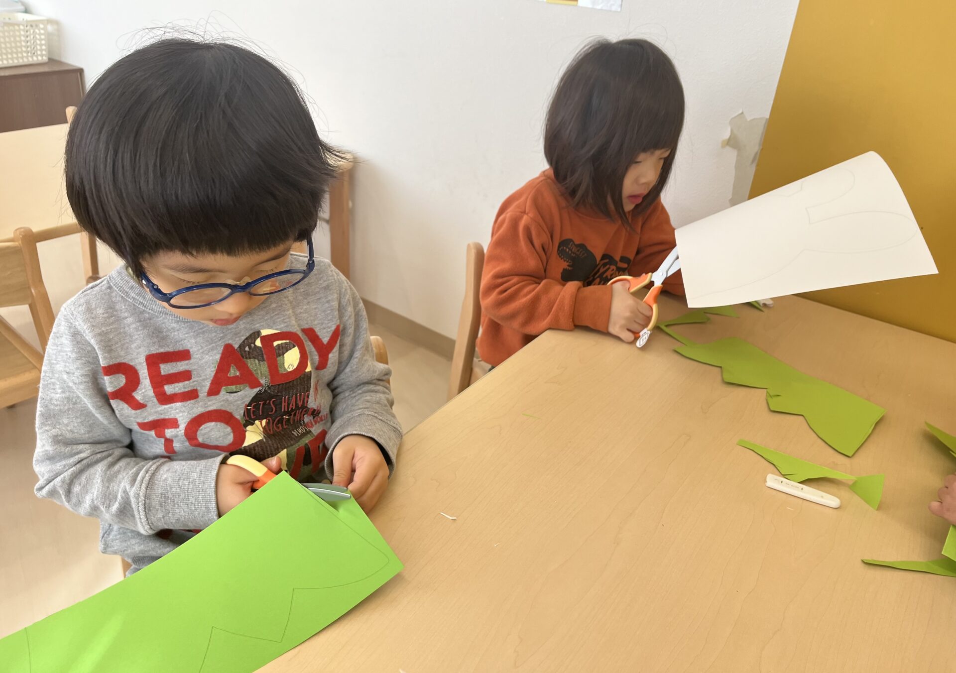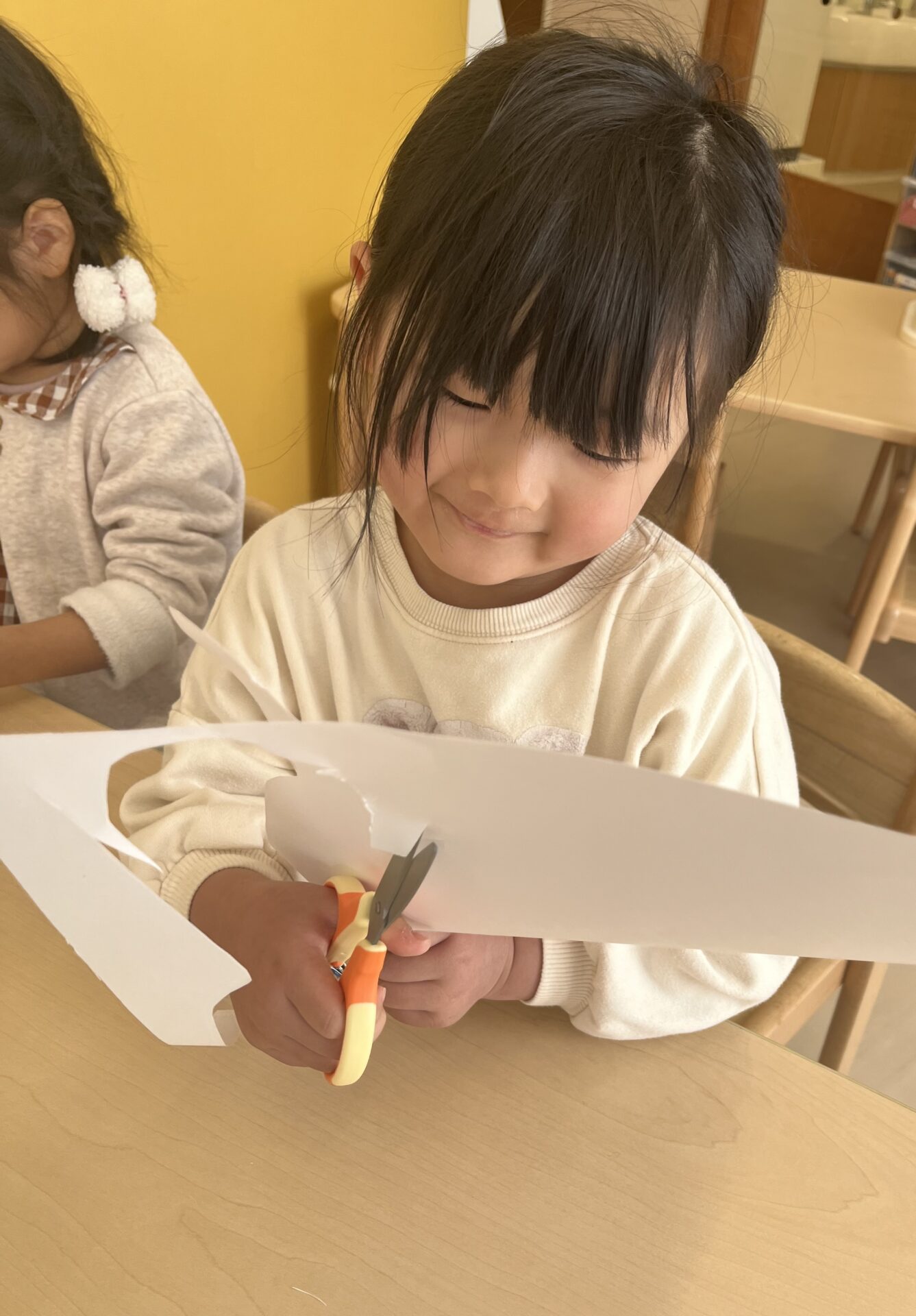 紙を回しながら切ると切りやすいことを伝えるとまたチャレンジし、最後まで自分たちで切ることが出来ました✂