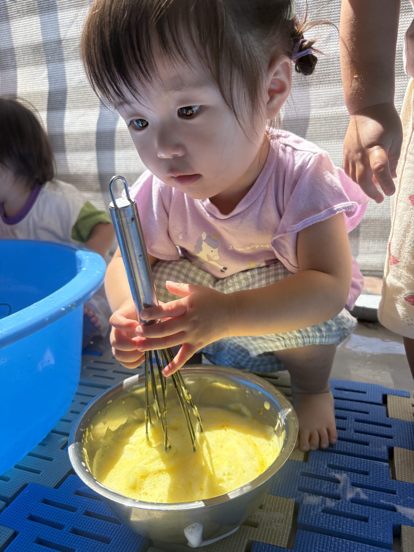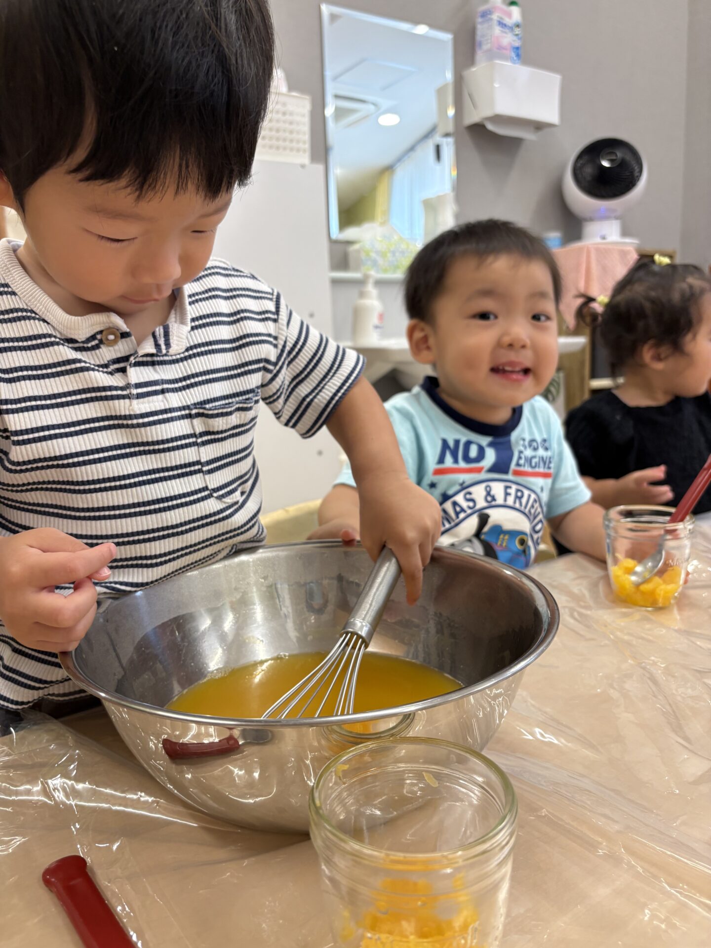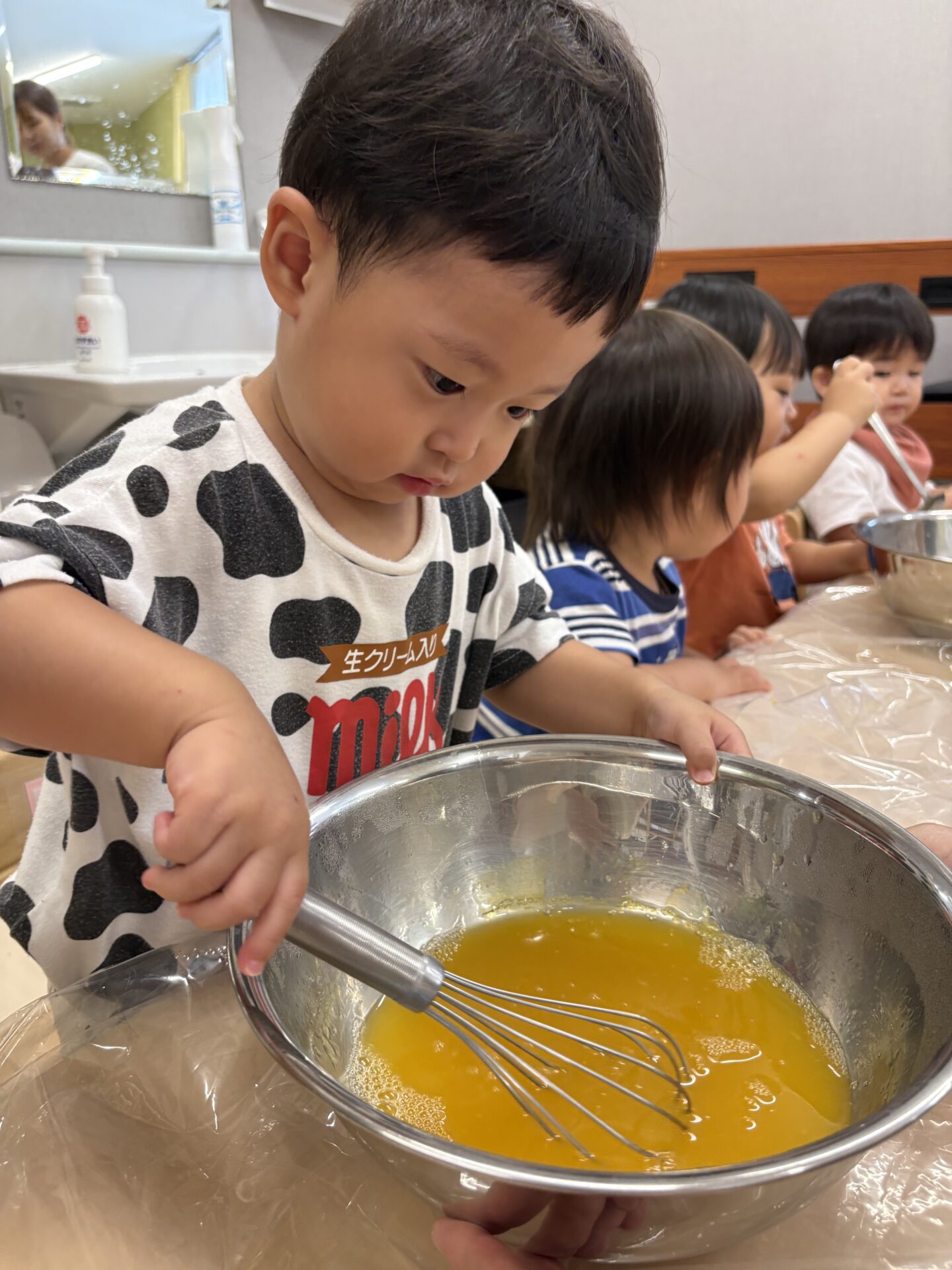 今まで遊びの中で泡だて器など使っていたこともあり得意げに混ぜたり入れたりと取り組む子どもたちでした😊