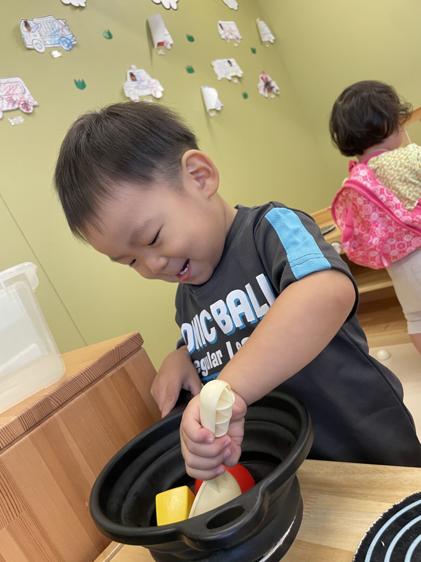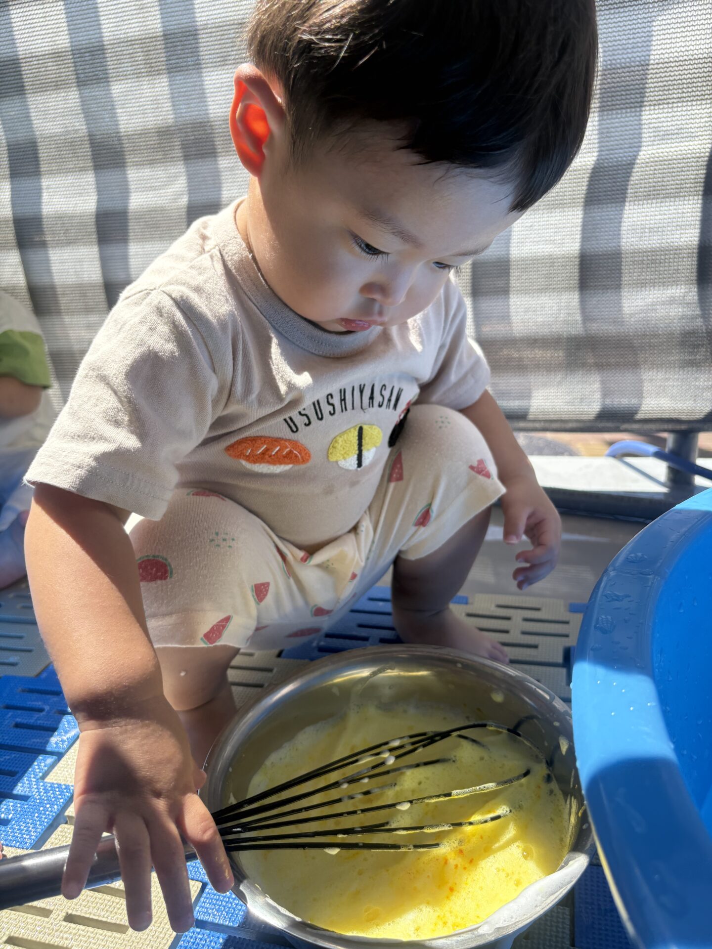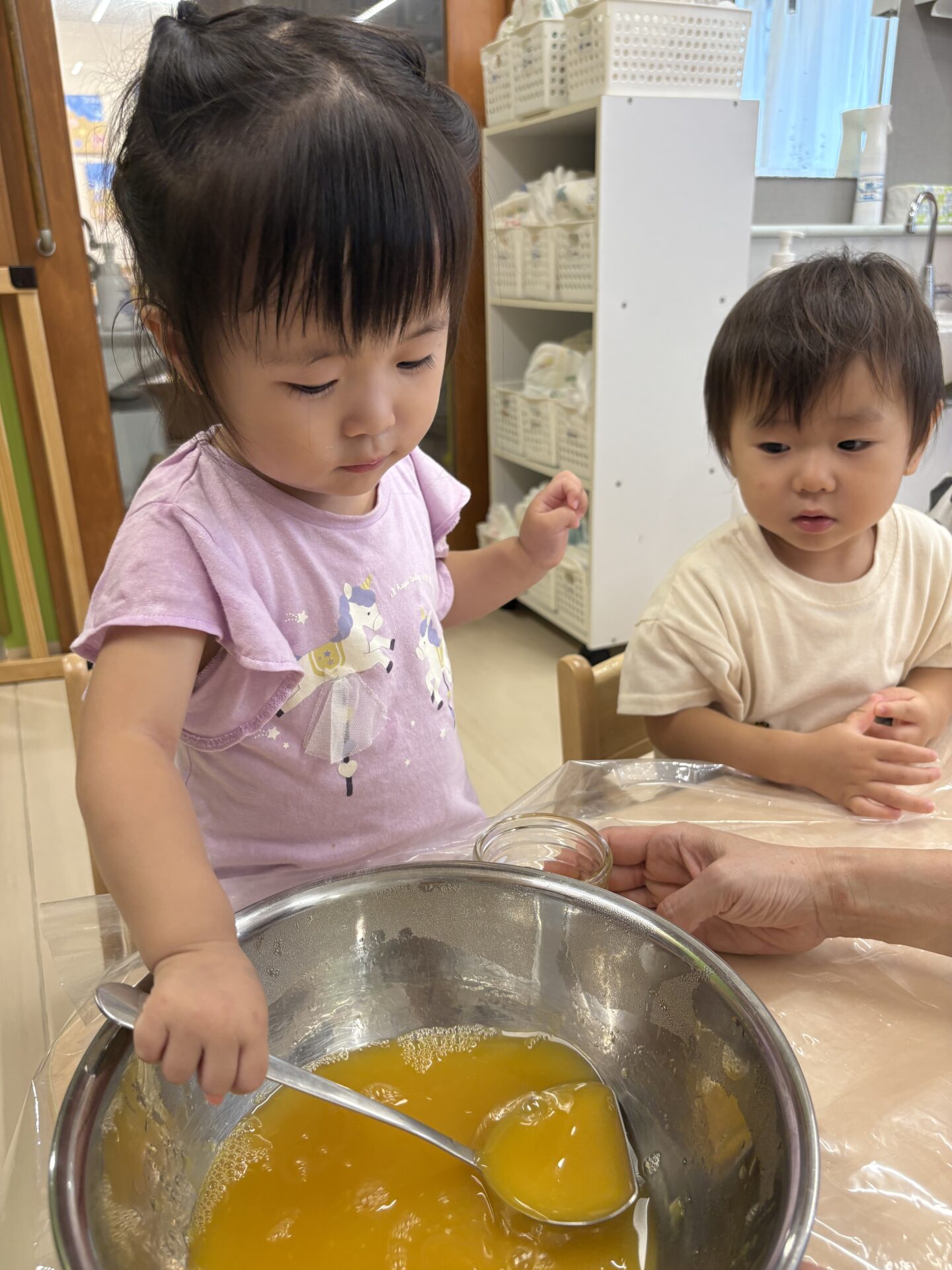 今まで遊びの中で泡だて器など使っていたこともあり得意げに混ぜたり入れたりと取り組む子どもたちでした😊