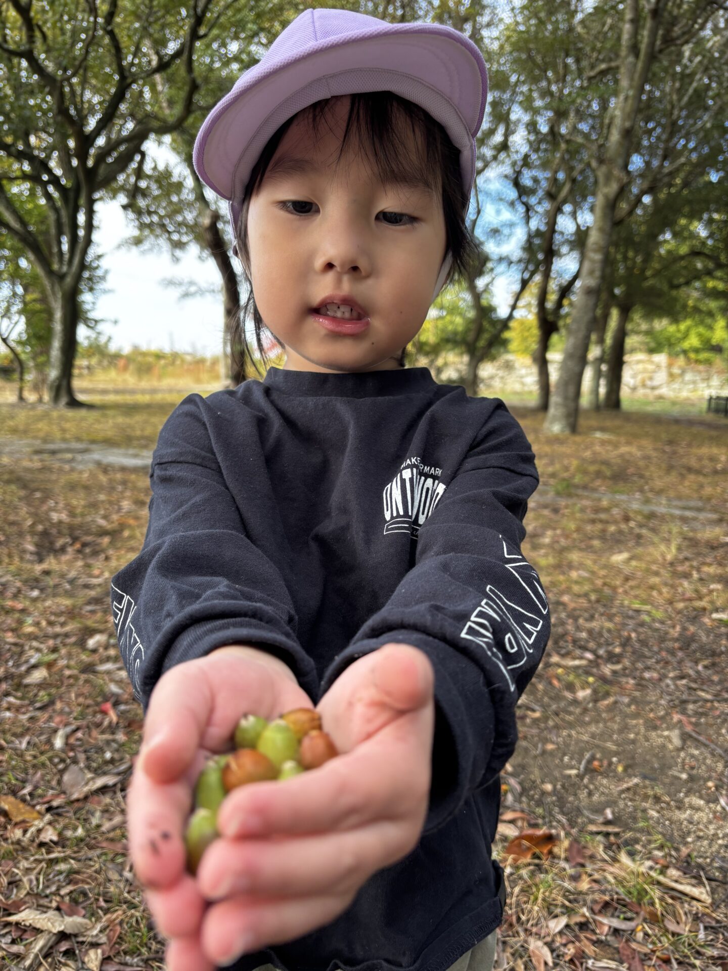 みんなでこれは?きれい?などと確かめ合いながら、きれいなどんぐりや落ち葉を探して丁寧にバックの中に入れていました。袋を破くことなく、器用に指先を使って上手に入れられるようになったあめぐみさん。これからのお散歩でも持っていき、たくさんの宝物を集めていきたいと思います!