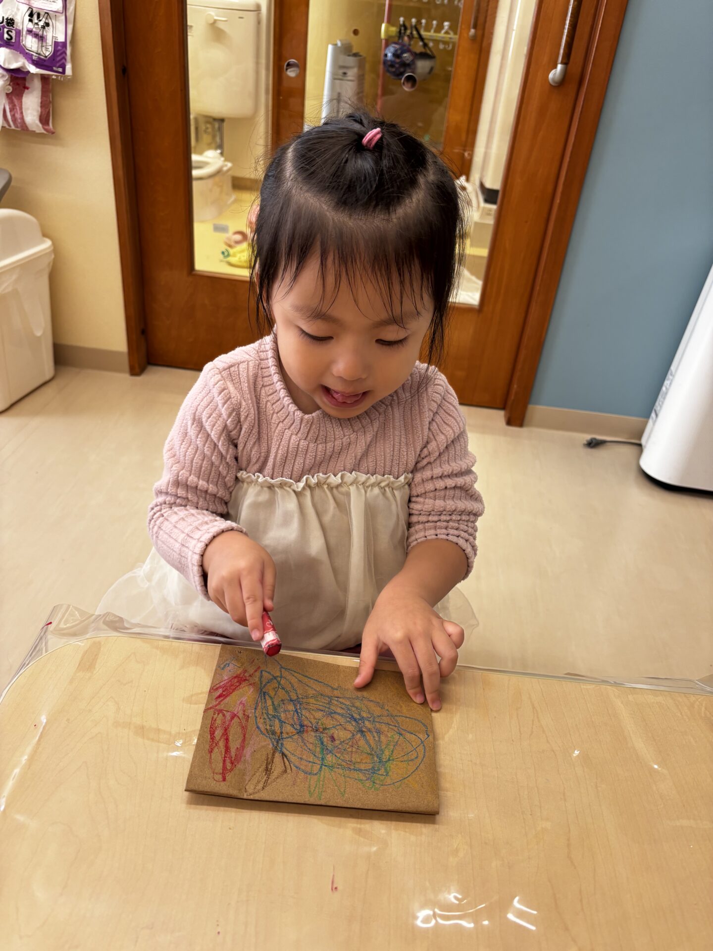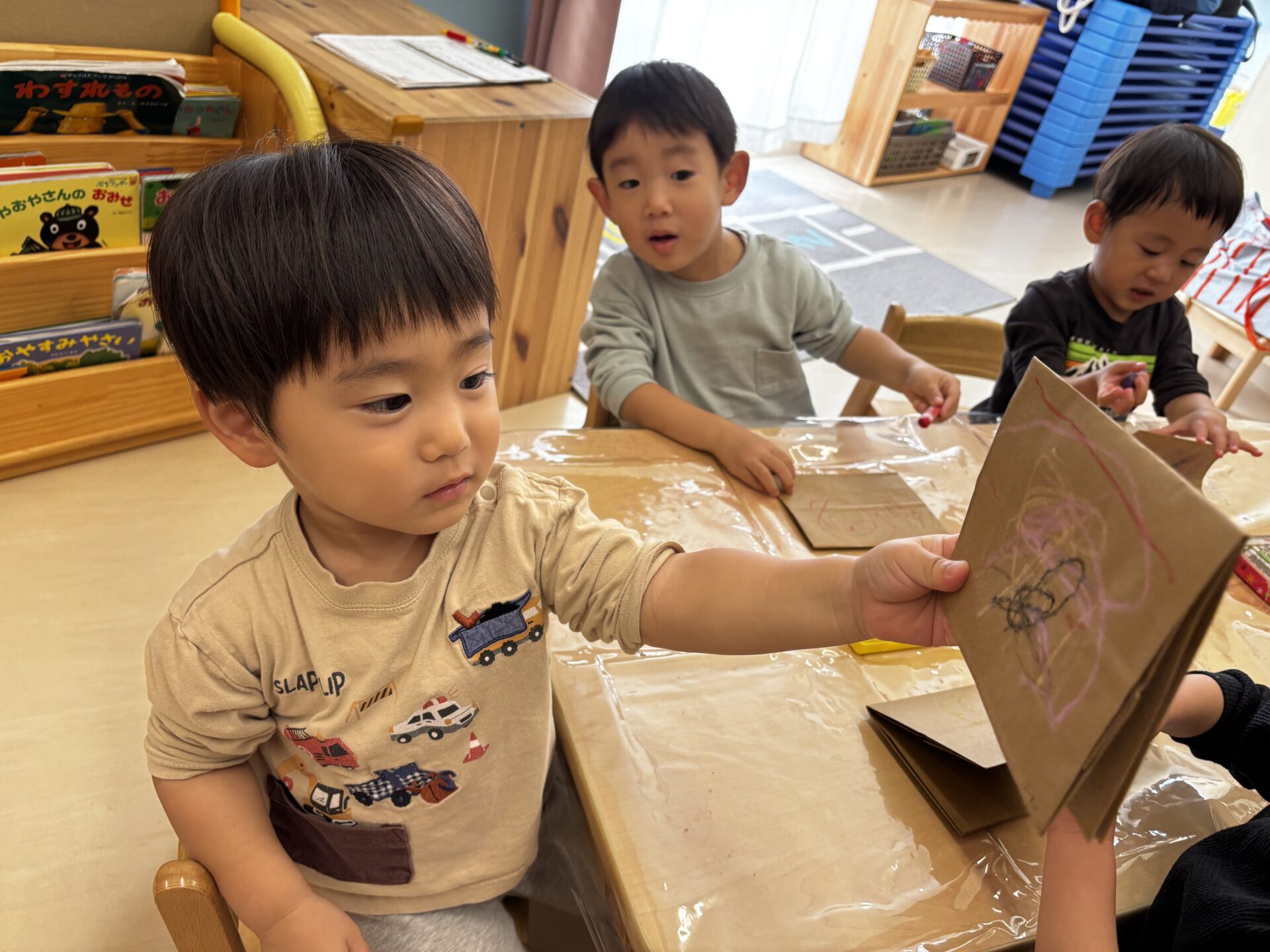 ペーパーバックにクレヨンで自由に絵を描いていきました🎨今までは、ただ、塗っていくことを楽しんでいましたが、何描いてるの?と聞くと、「アンパンマン!」「さつまいもだよ」と好きなものを思い思いに描いていました💗