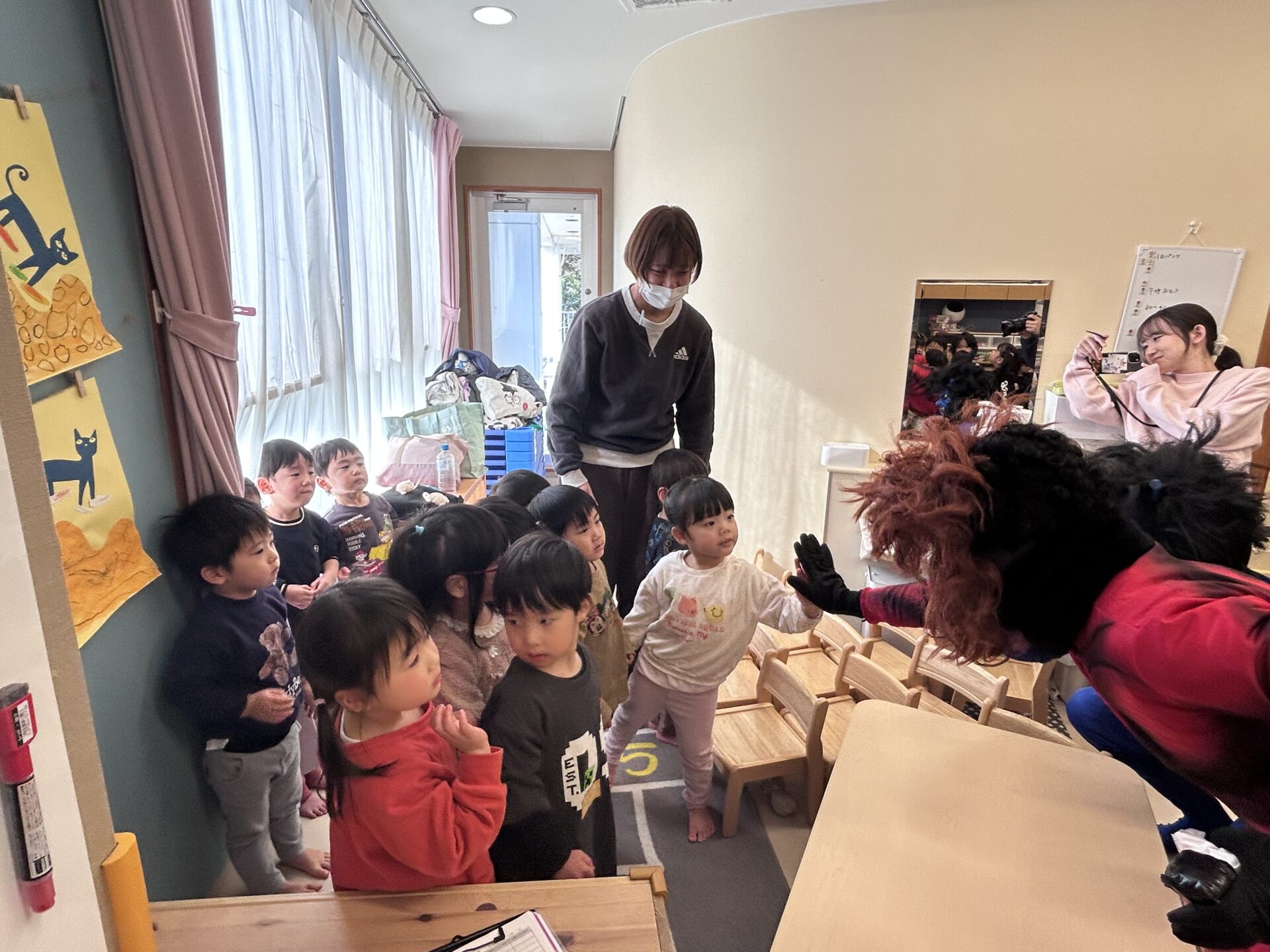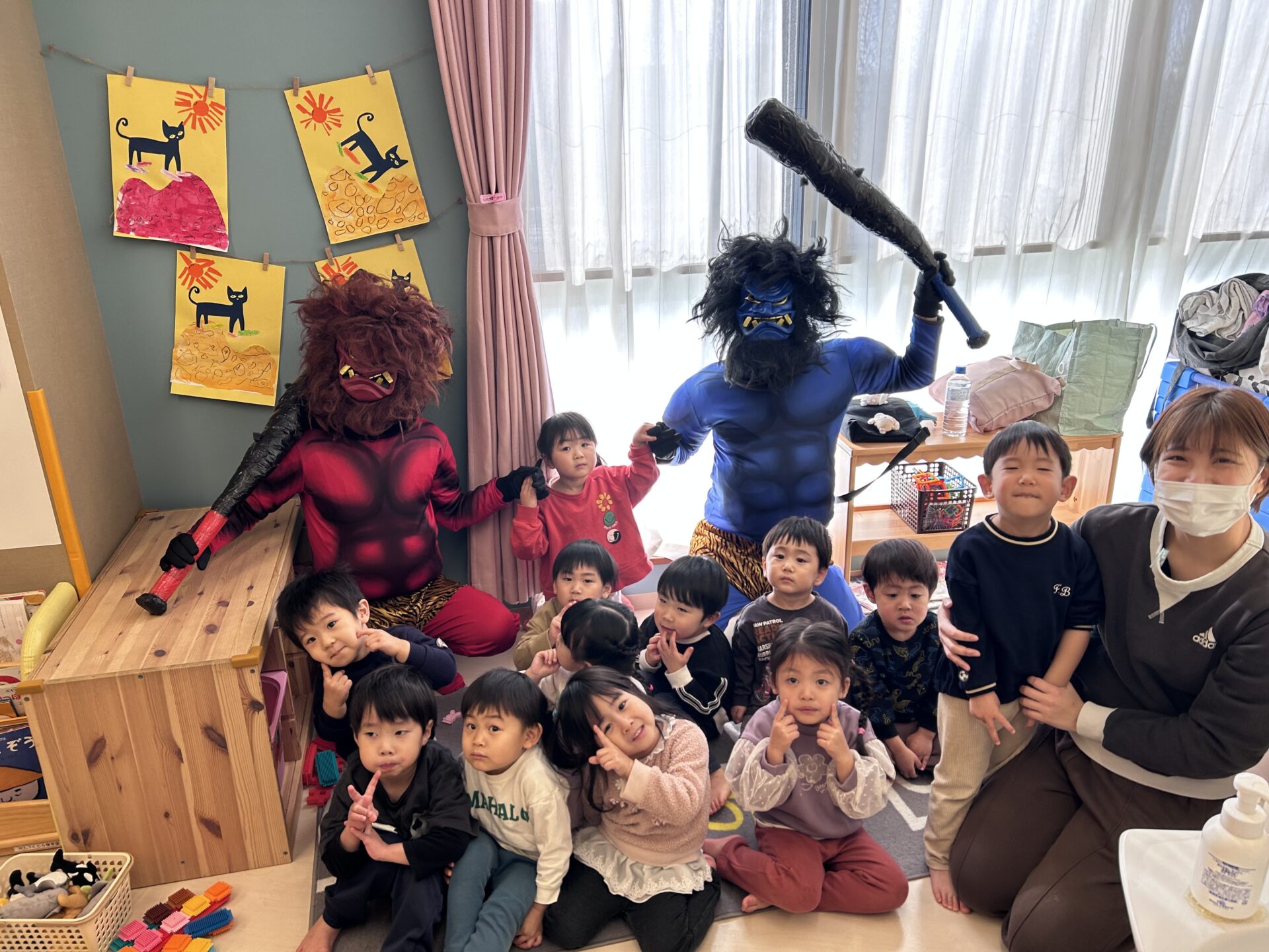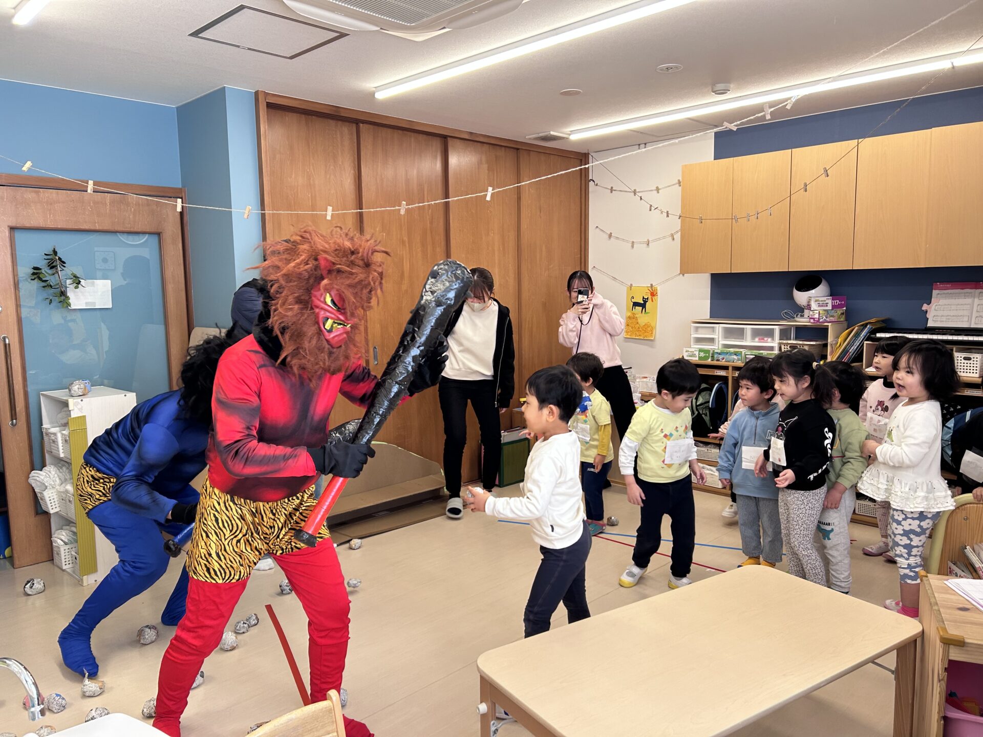 ★あめ組 「おにはそと!ふくはうちする!」と鬼が来る前からやる気満々の子どもたち。鬼が来ても、自分たちが作ったバリケードから、まずは豆を投げてみようと頑張っていました⭐鬼との撮影も仲良く楽しい雰囲気で行いました☺📷