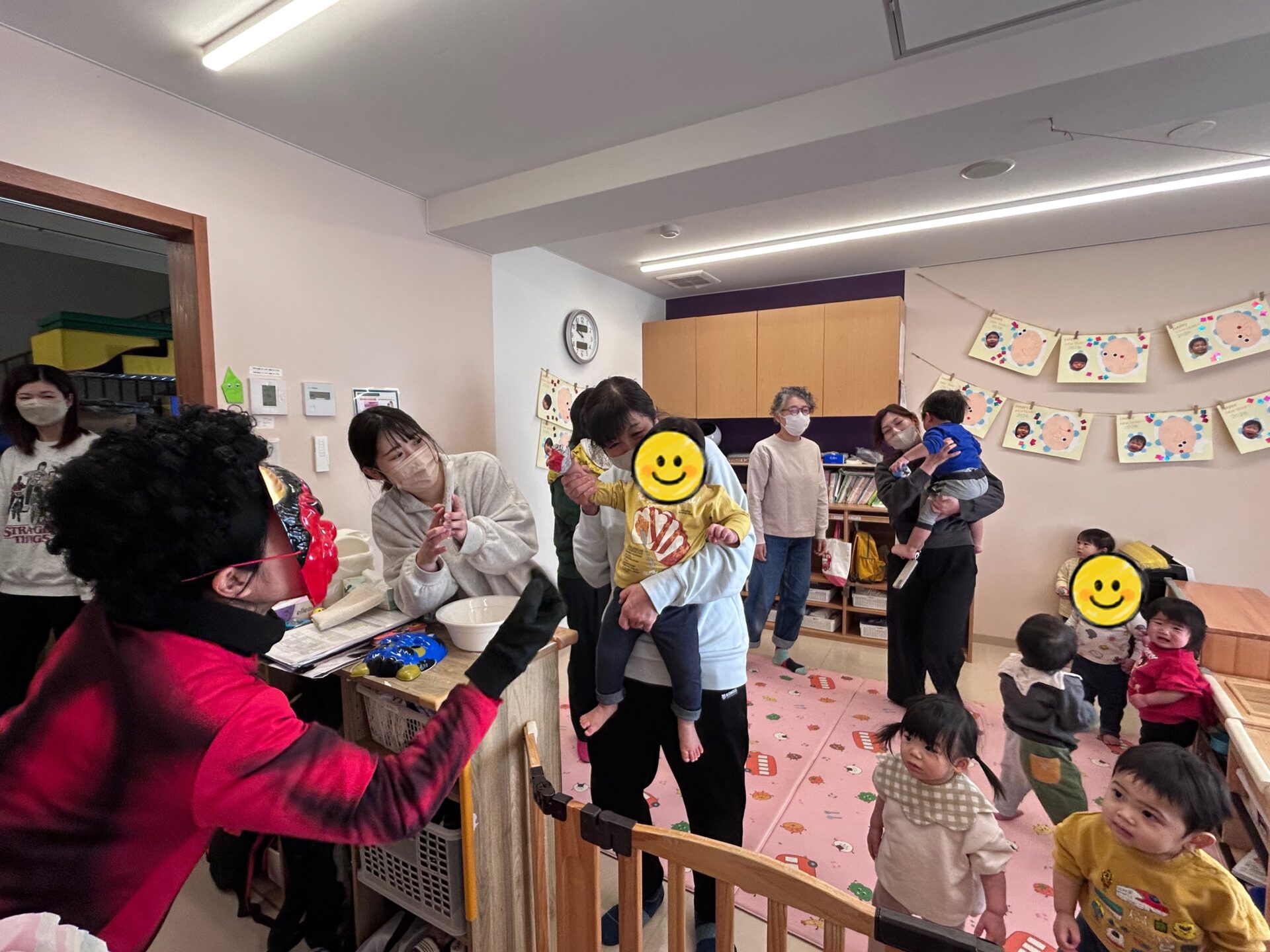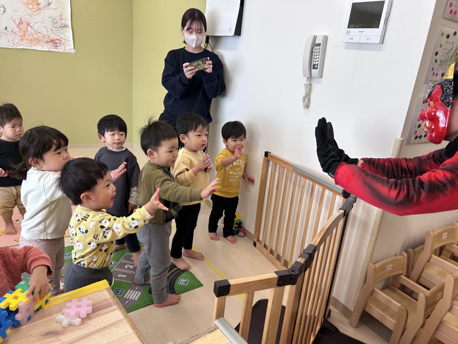 ★だいち組 おにを見てもほとんどの子どもが泣くことなく「おにはそと~!」と元気に豆を投げていました。「鬼さん次のところに行くね」と話すと「ばいばい!」と手を振っていましたよ👋