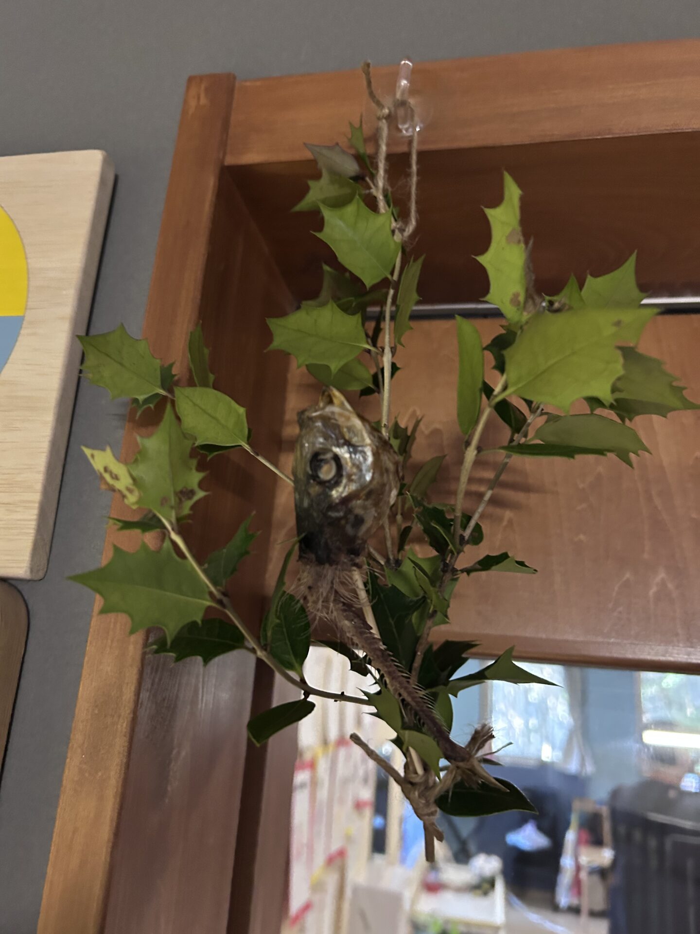 そういったことから、各クラスのドアに、みんなでヒイラギと焼いたイワシを飾りました。