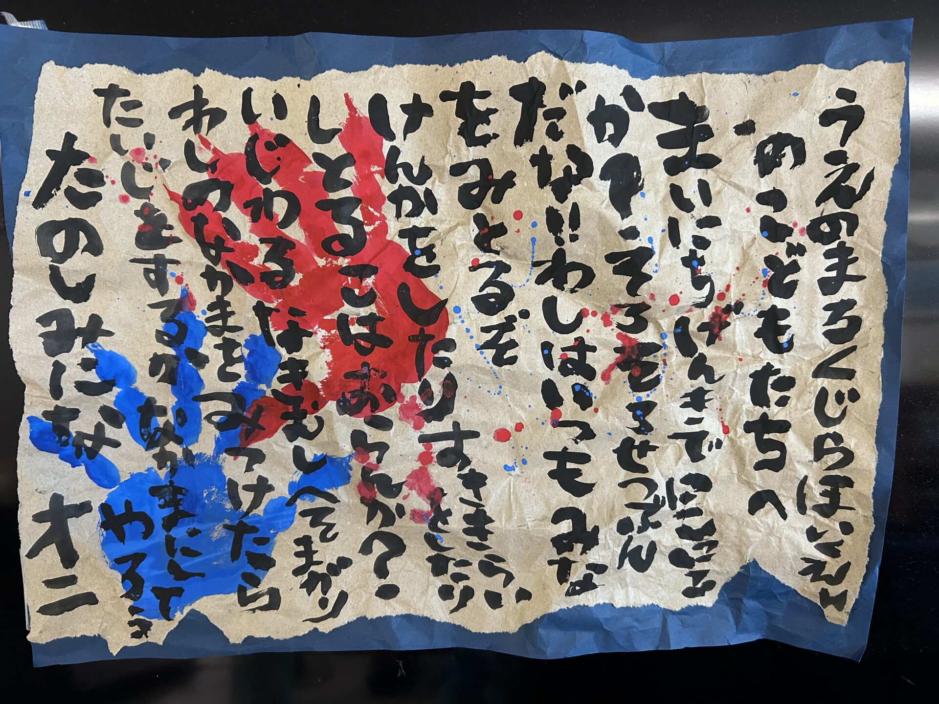 鬼と戦った後は、「悪い心を取ってください。」と一人ひとり言いながら『(事前に記入していた)じぶんの悪いところ』を書いた紙を鬼にはぎ取ってもらい、鬼と握手をすることができました。